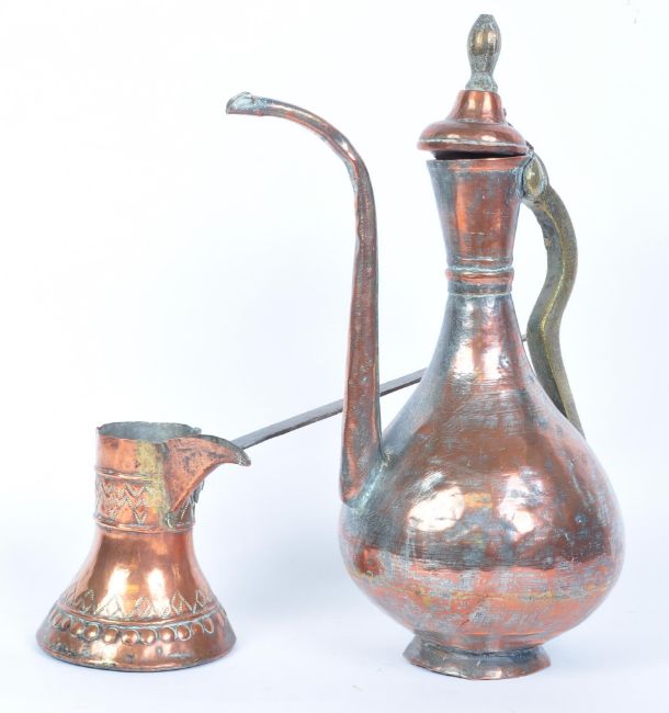 A 19th century Persian copper and gilt metal dallah coffee pot together with a briki coffee pot with incised decoration. Measures 41cm tall.