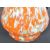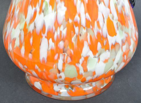 A retro vintage Czech orange glass splatter / mottled jug. With a blue spherical handle on the lid, with curved tapering body on a circular base. Measures approx. 30cm high.