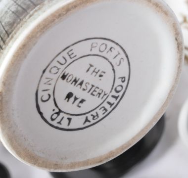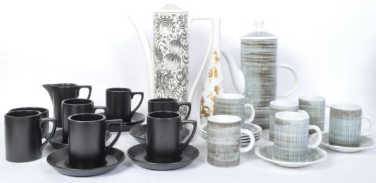 An assortment of vintage retro mid 20th century circa. 1960's china tea service pieces to include a Monastery Rye coffee service, a Denby style matt black coffee service and a Portmeirion Magic Garden Graphite teapot.