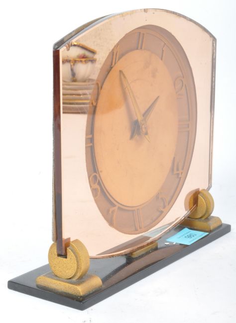 An Art Deco vintage early 20th Century peach mantel clock. The clock having a curved top with hands and numbers, on a rectangular ebonised base. With wind cup mechanism that appears to be working. Measures approx. 19cm x 22cm x 9cm