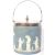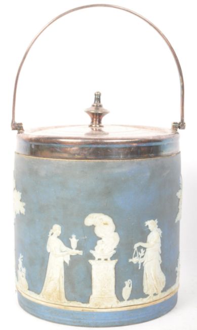 A retro vintage 20th Century Wedgwood Jasperware Dudson brothers biscuit jar / container. The stoneware item has a curved metal swing handle, metal lidded top with blue back drop and white silhouette decoration. Measures approx. 23cm tall.