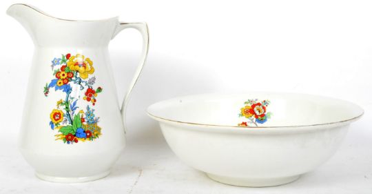 A vintage 20th century ceramic wash set decorated with transfer printed polychrome flowers. The set to include water bowl & water jug. The lot appears in overall good conditions with no apparent damage or repair. No marks present. Measures approximately 30cm tall.