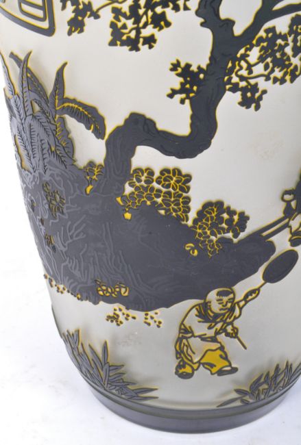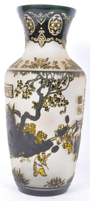 A vintage 20th Century Asian Oriental Peking glass vase. The vase having a rounded lip tapering into the neck, with a tapering body into a circular base. With scenes of ebonised Chinese people with instruments and rackets. Measures approx. 37cm tall. Condition; Overall good, there are some stains, mainly on the inside. Some adhesive substance on the body. No repairs or damage.
