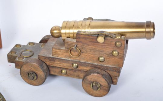 A collection of vintage 20th century curios comprising of a large brass egg timer, an 1895 India and Ceylon exhibition 1896 brass tray, wall mounted ships clock and barometer and brass cannon
