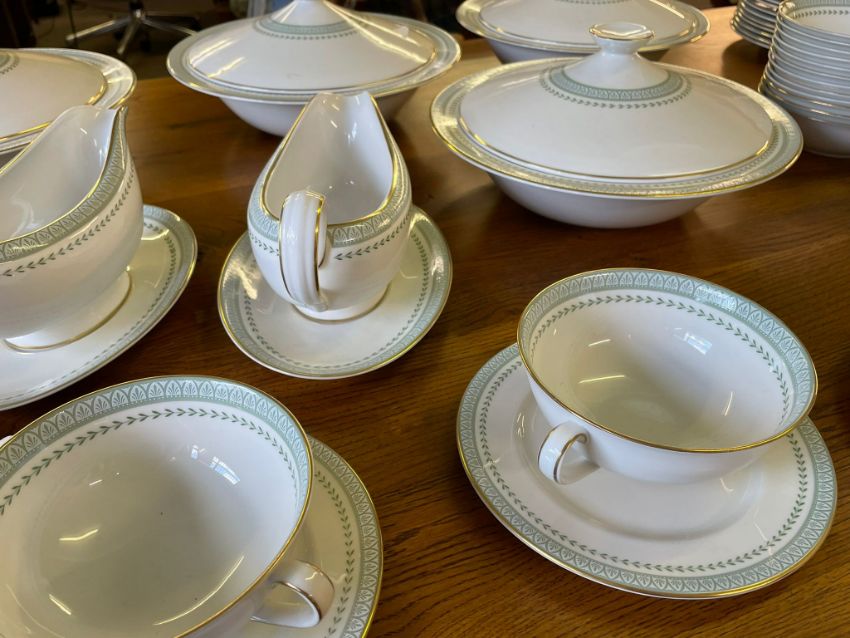 A vintage 20th century Royal Doulton "Berkshire" TC1021 dinner service for twelve people. The lot to include tureens, plates of various sizes, soup bowls with saucers, gravy boats & more. The service having a white background with sea green geometrically decorated edges & gilt rims. All marked to base.