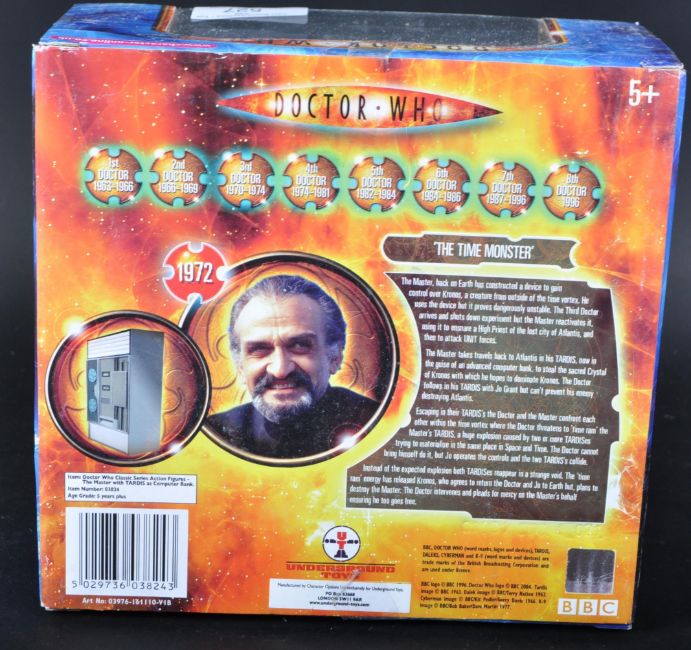 Doctor Who - Underground Toys - a boxed action figure set ' The Master With TARDIS As Computer Bank ' by Underground Toys. Contents appear mint and unused, box sealed (unsure if factory sealed). Box with some light wear from storage. Highly detailed Dr Who figure set.