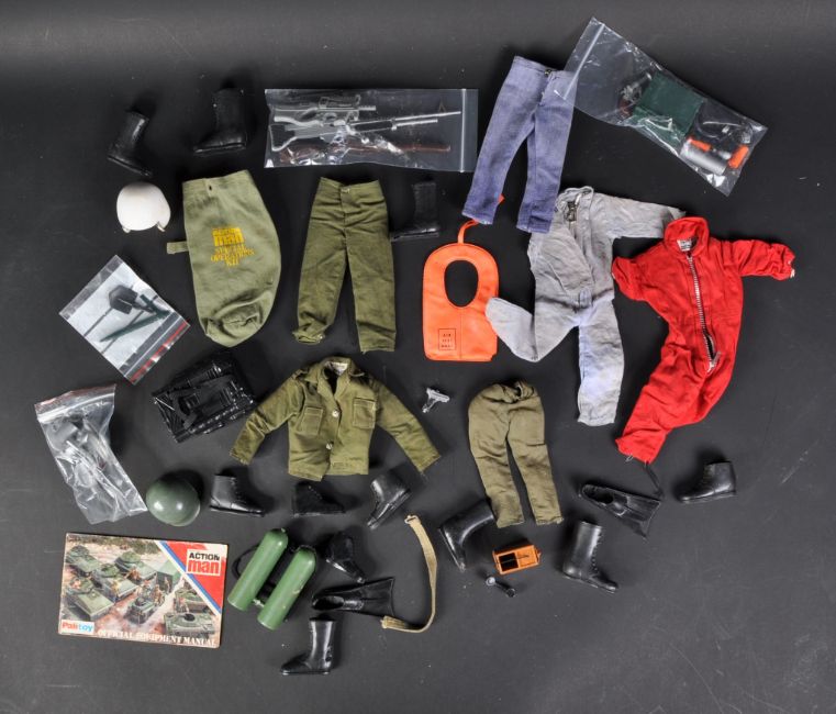 A collection of original vintage Palitoy Action Man clothing, weapons and accessories to include; Soldier Combat trousers and tunic, Special Ops kit bag, Parachutist Jumpsuit, Life Jacket, Boots, Scuba Pack, Helmets, Guns and more.