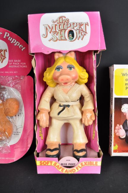 The Muppets - a collection of vintage 1980s Jim Henson ' The Muppets ' themed toys and memorabilia items to include; x3 thermos flasks, Bendy Toys Miss Piggy, Bendy Finger Puppet ' Fozzie Bear ' and others