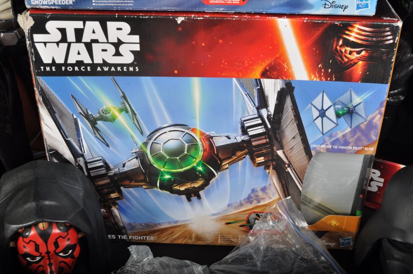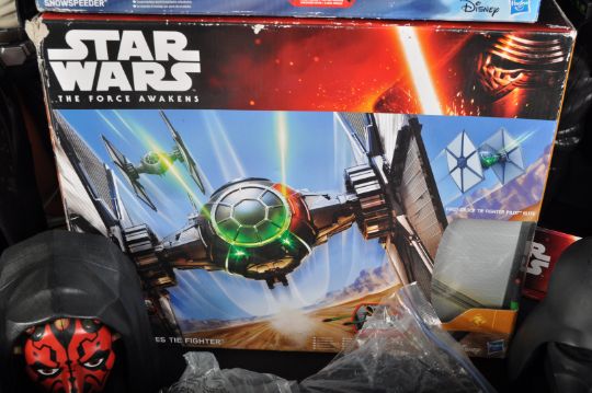 Star Wars - a large collection of assorted toys / memorabilia. Mostly 1990s and later, including some Force Awakens boxed playsets, a Jakks Pacific Darth Vader (boxed), a Han Solo Jakks Pacific figure (boxed), various loose Hasbro action figures, lightsabers, a Darth Vader mask, and various other toys.