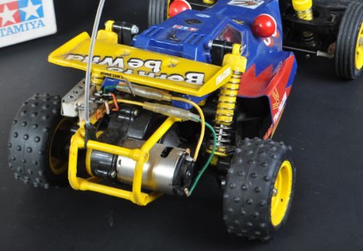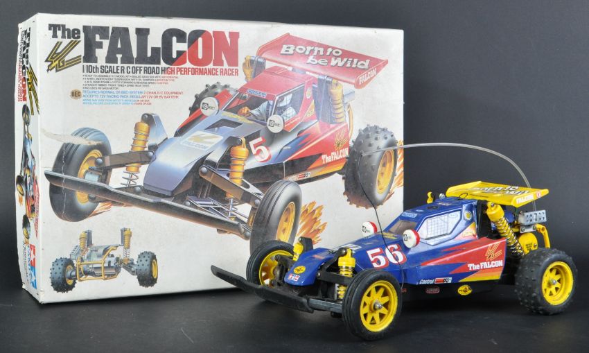 A vintage 1980's Tamiya 1/10 scale RC Radio Control off road buggy ' The Falcon '. The fully assembled model kit with original box, instructions and radio gear. Good example.