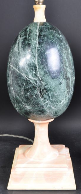 A pair of mid 20th Century marble table lamps in the manner of Maison Charles. Comprises a central large ovoid egg raised on tapered stem over stepped square base. Both in alternating verde mar and pesca marble. Measures approx; 54cm x 18cm x 18cm