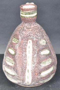 Guido Gambone (Italian 1909-1969) - An original mid 20th Century studio art pottery ceramic jug of segmented form. The jug having a mottled lava effect glaze in a puce purple tone. Decorated with indented cartouche panels depicting geometric lines. The base with Donkey signature (Guido not his son Bruno) and signed Gambone Italy 594. Measures approx; 20cm. Condition; no visible signs of major damage, some very minor crazing on close inspection.
