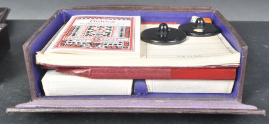 A retro vintage early 20th Century Art Deco period 1930s bakelite cased set of playing cards along with a vintage cased bridge set with score cards, markers and dice. Both appearing in good condition but sold as unchecked.