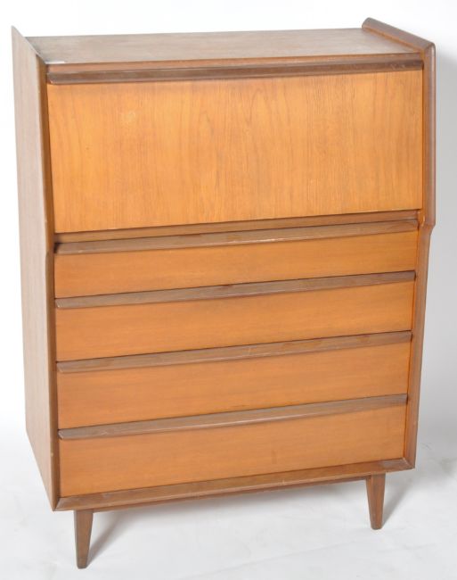 A retro mid 20th Century Danish influenced teak bureau desk of slender upright form having a fall front bureau section top with fitted interior and padded leather writing skiver. Below a bank of four drawers each with angular handles. All raised on tapering supports. Measures approx; 104cm x 76cm x 41cm.
