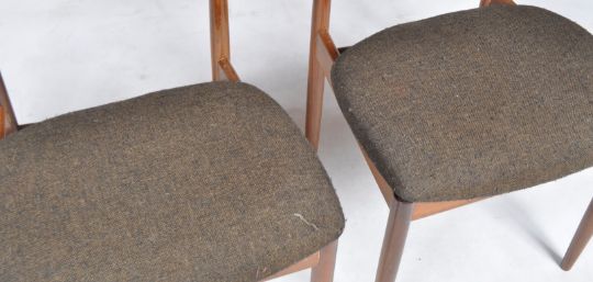 IB Kofod Larsen - G Plan - Danish Design - A retro 20th Century Designer dining table a matching four chairs. The extending table of rectangular form with two extra leaves with shaped frieze below with all raised on tapering supports. The chairs with curved backrests and padded seats raised on tapering legs. Makers marks present. Wear commensurate with age with watermarks to the top of the table. Table measures approx when closed; 73cm x 153cm x 89cm. When open 242cm. Each chair measures approx; 76cm x 45cm x 47cm.