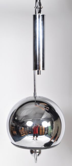 A retro 20th Century Designer rise and fall counterweight pendant ceiling light having a large chrome domed shade with suspended bulb. Supported via a pulley weight mechanism. Sold as untested by ourselves. Measures approx; 52cm x 29cm.