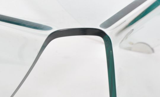 A large and impressive retro 20th Century modernist lobby coffee table / low table. Constructed from formed 10mm Art glass with four off set demilune shaped legs raised on chrome levels. Measures approx; 45cm x 87cm x 87cm.