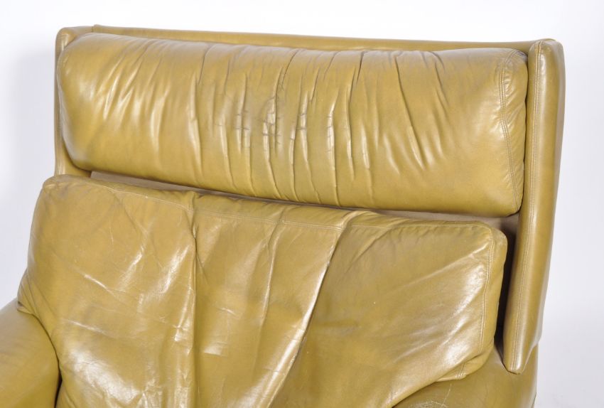 Attributed to Werner Langenfeld - A large retro vintage mid 20th Century Danish swivel easy lounge chair / armchair having feather cushioned back and seat rest with all upholstered in mustard yellow. All raised on a five point star base. Unmarked. Wear commensurate with age, mostly to the leather. Measures approx; 90cm x 90cm x 97cm.