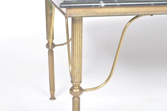 A 20th Century Hollywood Regency brass framed coffee table / low table of rectangular form having a faux green marble top with stenciled Greek key decoration to the border. Raised on tapering reeded brass legs with brass wire supports. Measures approx; 43cm x 102cm x 51cm.
