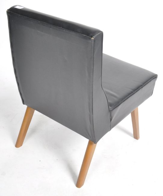 A retro vintage 1960s cocktail chair / accent bedroom chair having rising a single piece faux black leather seat and back raised on shaped legs. Measures approx; 73cm x 48cm x 57cm.