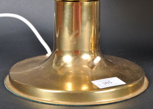 A matching pair of retro 20th Century Italian designer table lamp lights having iridescent glass globe shaped shades raised on a brass circular bases. Each measures approx; 38cm x 23cm.