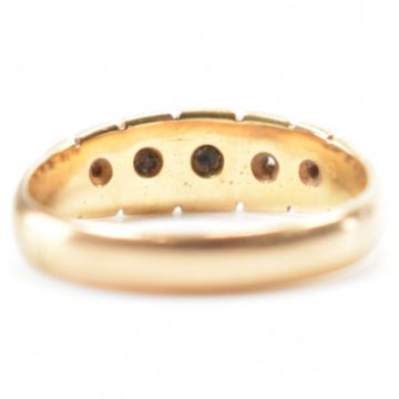 A vintage 18ct gold & diamond five stone ring. The ring having five star set diamonds with scrolled shoulders & a plain shank. Hallmark / mark rubbed but tests indicate 18ct. Central diamond measures approx 1.5 x 1.5 x 1.7 mm. Weighs approx 5.1 g. Size U.