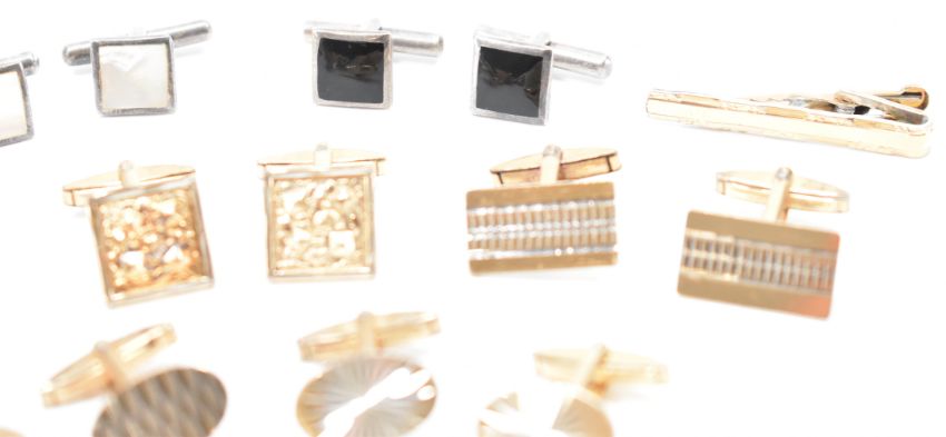 Assorted white metal & silver cufflinks, tie clip & tie pin. Weighs approx 65.4 g.