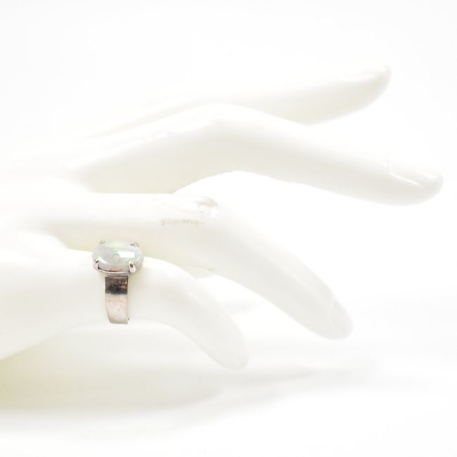 A white metal & opal cabochon ring. The ring having a prong set opal cabochon to a plain tapered shank. Unmarked, tests indicate gold. Weighs approx 2.7 g. Size I.