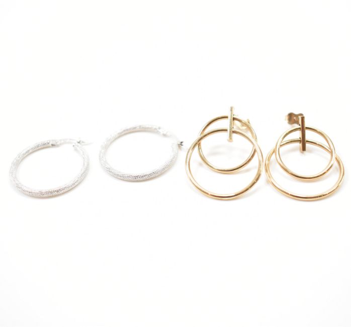Two pairs of 9ct gold hoop earrings. A pair of wight gold textured earrings stamped 375 together with a pair of concentric hoop earrings united by bar, having post backs with butterfly fasteners, hallmarked Birmingham. Weight 3.9g. Measures approx 2.2cm diameter