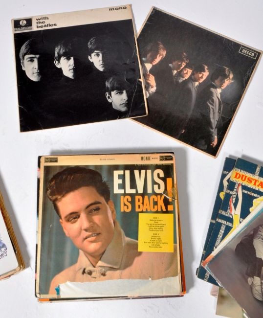 A mixed collection of approx 30 Rock / Pop long play LP vinyl records of varying artists to include With The Beatles (Mono - PMC1206), The Rolling Stones (Mono - LK4605), Queen - The Works (SP8402), selection of Elvis Presley records comprising Rock 'n' Roll No.2, Golden Records 1 & 2, Blue Hawaii etc.