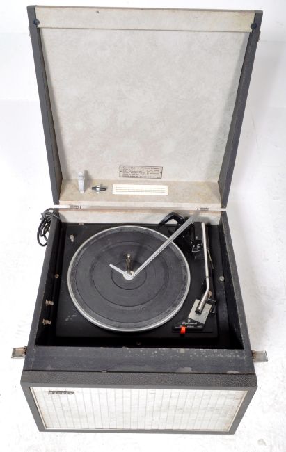 Hacker - Hi - Fi - A  faux leather cased record player turntable model GP42 having a Garrard 2025TC turntable deck set within. Together with a matching stereo loudspeaker / amplifier. Sold as untested by ourselves. Record player measures approx; 24cm x 41cm x 45cm.