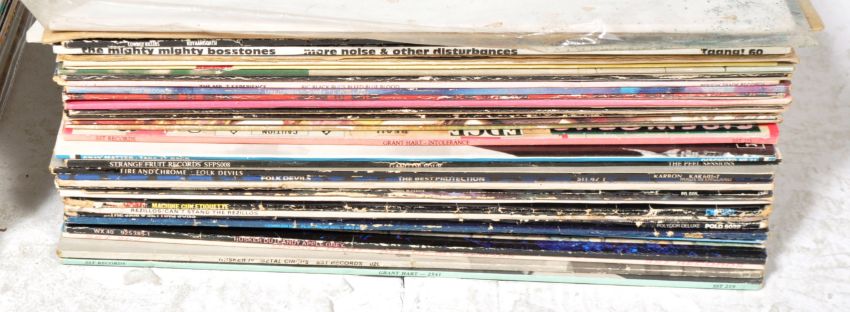 Alternative / Indie - A mixed collection of approx 60 long play LP vinyl records of varying artists comprising Stiff Little Fingers - Go For It (CHR1339), The Enemy Within - Support The Miners (RTT151), Jam - Sound Affects (5035), King Blank - Mouth Off (SIT51T), The Leather Nun - Plays Abba (WRMS009) other examples, Legal Weapon - Your Weapon (LW1100), The Lewd - American Wino, Mad Parade - A thousand Words (BYO019), Mekons - Crime and Punishment (SIN002) and more examples, Zero Boys - Vicious Circle (TXLP-11), CUD, Husker Du - Candy Apple Grey (WX40), Lemonheads - Hate Your Friends (TAANG! 15), Membranes - Kiss Ass Godhead (GLALP028), The Mighty Mighty Boss Tones, Pegboy, Ramones, Redskins, The Pietasters, Surfers, The Clash, Chron Gen, The Damned, Cowboy Killers, Dinosaur Jr, Gray Matter, The Jam and many more. Mostly in VG and above conditions.