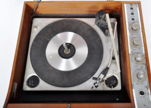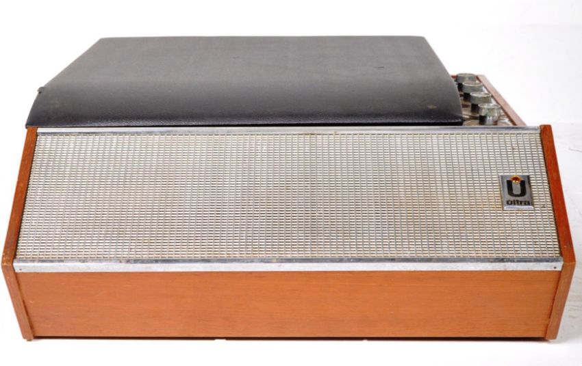 Ultra - Model 6018 - A vintage teak cased portable record player having a hinged cover opening to reveal a BSR turntable deck. Sold as untested by ourselves. Measures approx; 17cm x 44cm x 53cm.