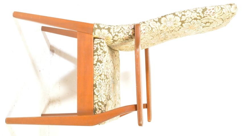 Parker Knoll Furniture - Mid century teak wood upright armchair. Raised on squared legs with shaped elbow rests flanking a tapestry upholstered seat and back rest. Measures approx. 119cm x 67cm x 62cm.
