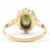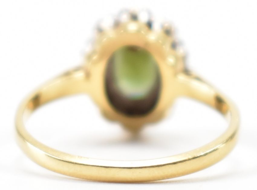 A hallmarked 18ct gold green stone and diamond halo ring. The ring being set with an oval cut green stone with a halo of diamonds surrounding it. Hallmarked Birmingham 1978. Weight 3.3g. Size K.5.