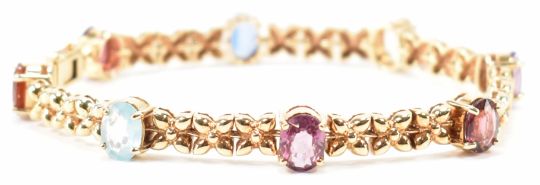 A 9ct gold and gem set bracelet. The bracelet set with 8 oval mixed cut gems to fancy link chain and snap clasp. Marked 375. Total weight 19.14g / Length 18cm approx.