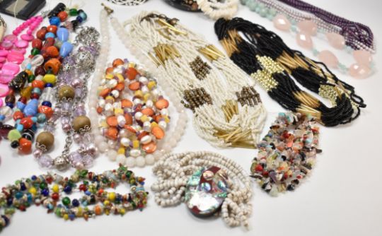 A collection of vintage costume jewellery beaded necklace and bracelets. The lot to include yellow metal chain necklaces, glass beaded necklaces, bangle bracelets, assortment of beaded necklaces, bangles and bracelets.