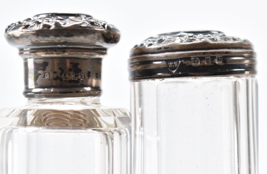 A collection of silver topped dressing table bottles. The bottles having floral moulded lids (all hallmarked between 1897 - 1934) together with a glass bottle with a pierced repousse silver casing (hallmarked London 1899). Tallest measures 18cm. Silver weight approx 79.3g.