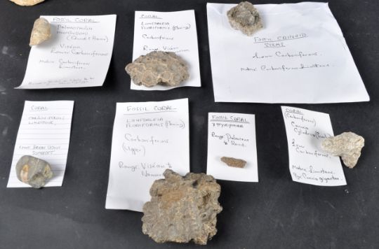 Fossils - A large collection of fossil corals to include: Lonsdaleia Floriformis, Carboniferous Limestone, Palaeosmilia Murchisoni, Lower Carboniferous, Sea Urchins (polished and unpolished specimens), Crinoids, Anthozoa, Echinopora, Sea Lilies, from various countries around the world to include locally found specimens, most with labels and parcelled. Approx. 70 specimens, largest being: 13cm x 9cm.