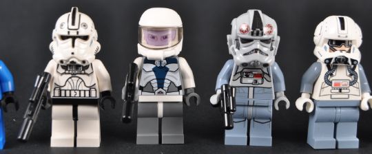 Lego Minifigures - Star Wars -x7 original Lego Star Wars minifigures comprising; Shadow Trooper, Senate Commando, Umbaran Soldier, Stiormtrooper (no helmet), AT-AT Driver, and x2 Clone Trooper Pilots. Figures appearing mint.