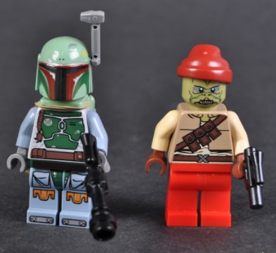Lego Minifigures - Star Wars - x2 original Lego Star Wars minifigures comprising Boba Fett (beard stubble head) and Kithaba from set No. 9496 Desert Skiff. Figures appearing mint.
