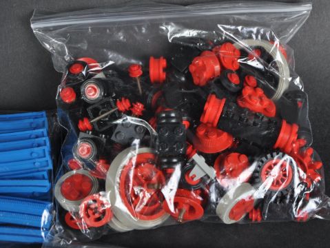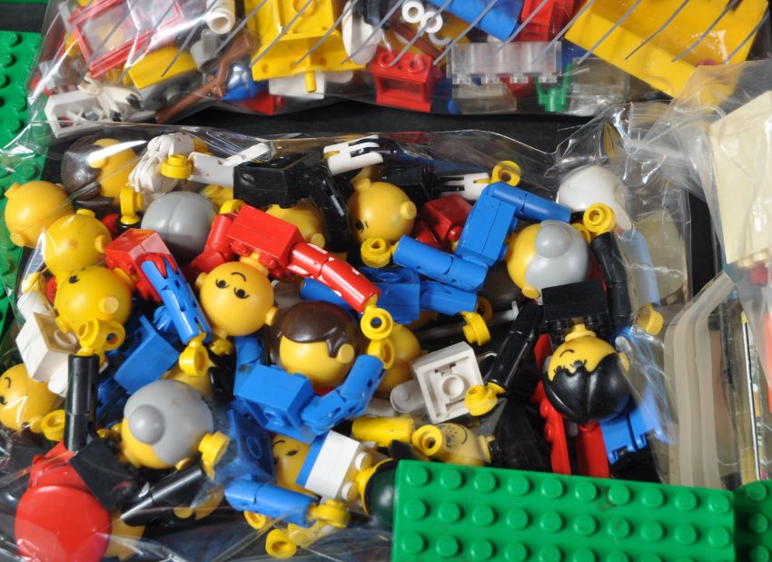 A large collection of assorted loose Lego bricks, minifigures and instruction manuals. Largely vintage pieces to include 1970's minifigures, base plates, cogs and wheels, various instruction booklets from Legoland Space and Star Wars, a bag of Bionicle pieces (likely set 8758 Tower of Toa) and other smaller accessory pieces.