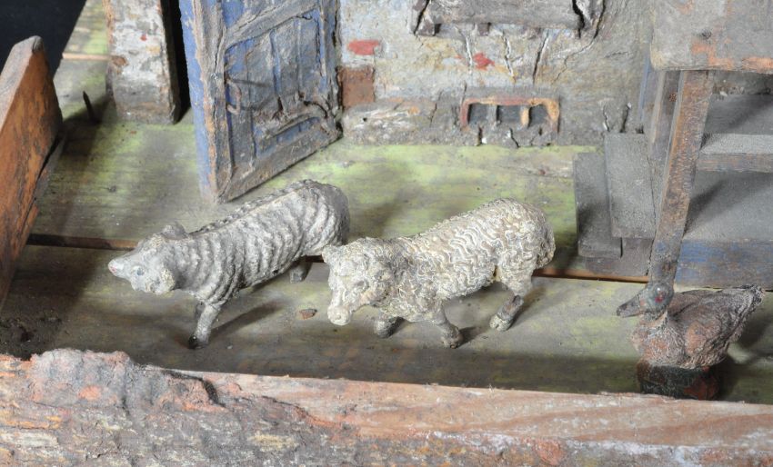 An early 20th Century / pre-war German Elastolin made model farm compound diorama with various buildings and farm animals. The farm yard of wooden construction finished with a composition coating having two main buildings, water trough and surrounded by an outer perimeter fence. Animals and people comprising sheep, cows, chickens and others. Some freestanding examples and some mounted to bases with Elastolin maker mark to the bases. Compound measures approx 74x42cm.