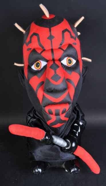 A collection of three teddy bears to include; Darth Maul, Master Yoda and another dressed in Darth Vader's uniform.