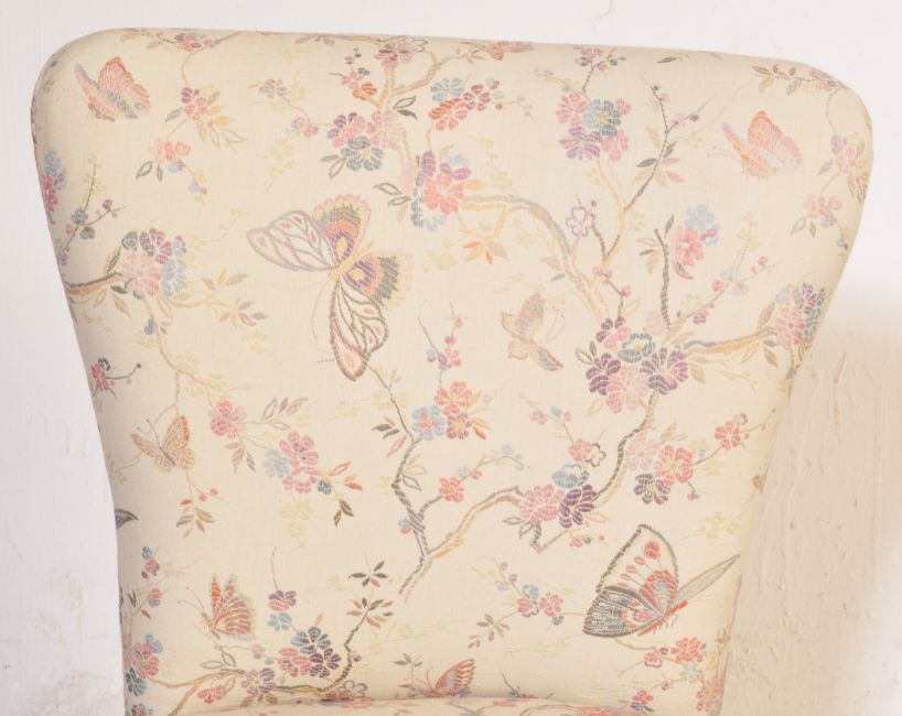 Pair of retro vintage 20th century bedroom upholstered chairs having spoon backs over tapering wooden legs. Each chair measuring 74x52x53cm.