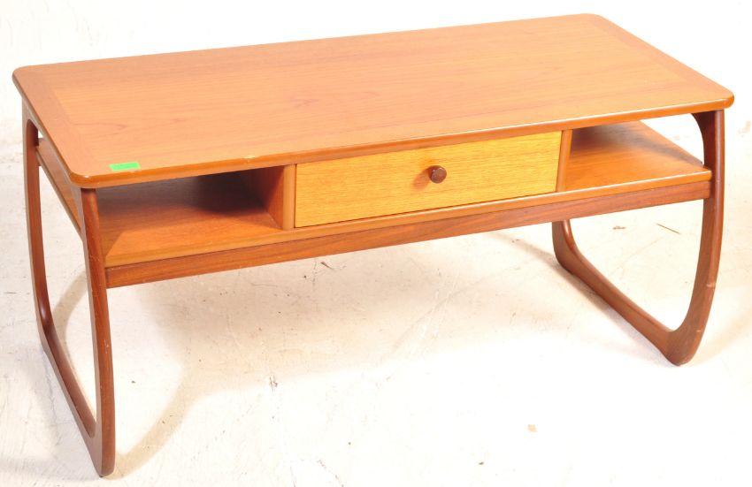 Nathan Furniture - A vintage retro mid 20th century teak wood coffee table having cross banding to table top with single drawer beneath raised over square frame supports. Measures approx; 50 x 107 x 46cm