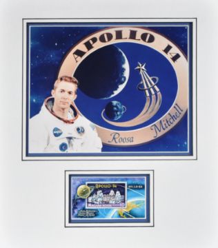 Space Exploration - Stuart Roosa (1933-1994) - Apollo 14 - autographed Apollo 14 stamp cover. Signed neatly in black ink to a lighter area of the piece. Professionally mounted beneath a photograph of him in uniform. Mounted, ready for framing. Total size; 40cm x 35cm.