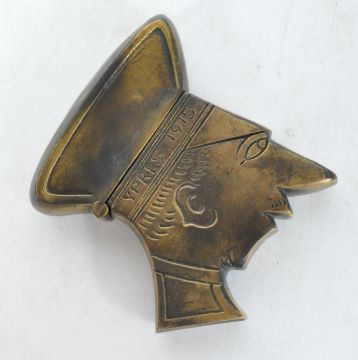 A vintage 20th century brass vest case in the form of a World War One WWI soldier with engraved features and Ypres 1915 Trenches inscribed along military hat. Measures approx 7cm length.