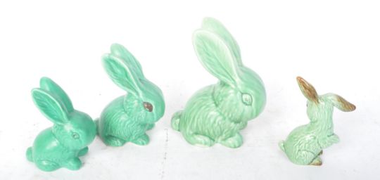 A group of four vintage 20th century Sylvac Pottery bunny rabbit figurines in a green colourway to include model 1307 and 1065. Measures 20cm tall. Good condition overall - crazing present.