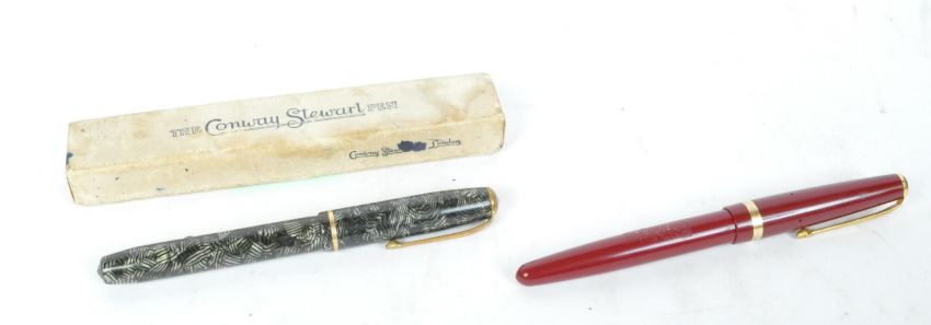 A pair of vintage British made Conway Stuart fountain pens. With gilt inlay, screw caps and 14ct nibs. Measures approx. 13.5. One with original box and paper guarantee.